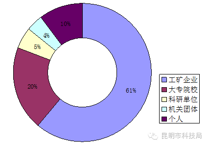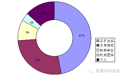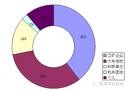 2016年上半年工矿企业发明专利申请985件、占发明专利申请量的40%,大专院校发明专利申请809件、占发明专利申请量的32%,科研单位发明专利申请359件、占发明专利申请量的14%,机关团体发明专利申请60件、占发明专利申请量的3%,个人发明专利申请280件、占发明专利申请量的11%。