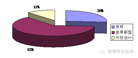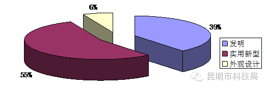 2.昆明市2016年上半年发明专利申请、实用新型专利申请、外观设计专利申请的构成比例为3.9:5.5:0.6,发明专利和实用新型专利占申请量的九成,专利申请的总体结构较合理。