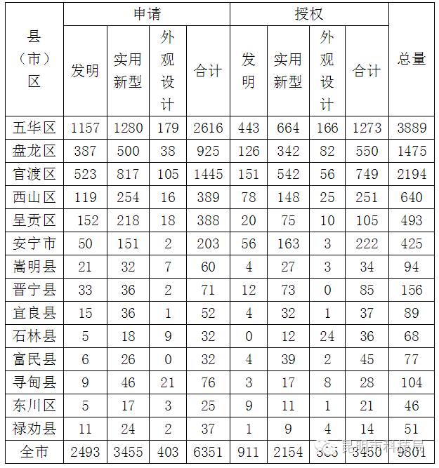 表1:昆明市各县区2016年上半年专利申请授权情况统计表